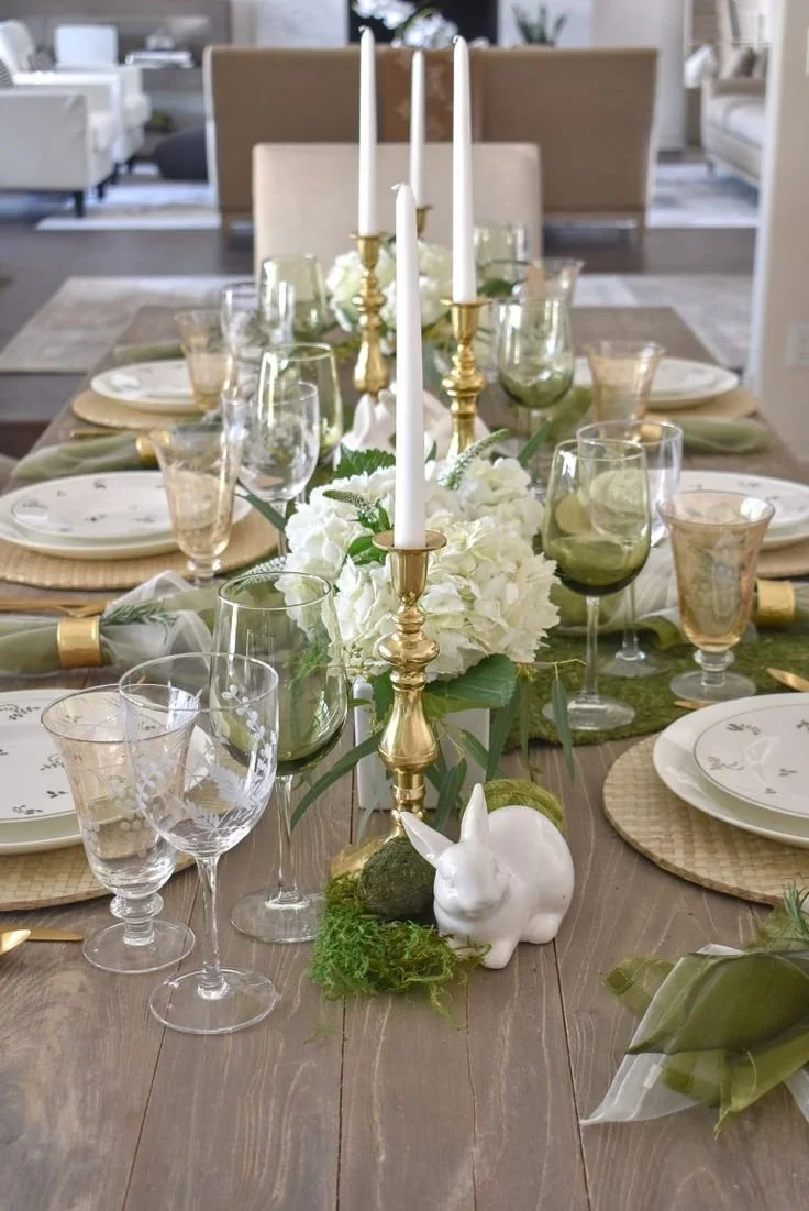I like to layer in soft sage, olive, or even deeper moss tones through napkins, dishes, surprise eggs, or simple stems. It doesn’t have to be bold. Even the smallest hint of green can wake up a table and make it feel seasonal without trying too hard.